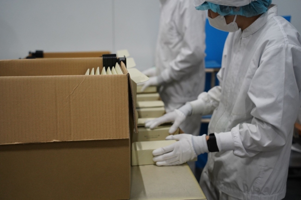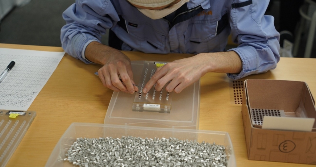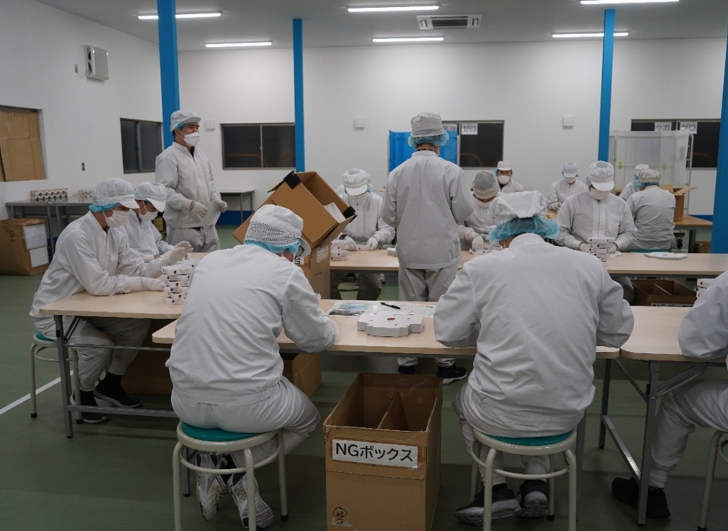 ライン作業のようにそれぞれ決められた工程を担当。時期により生産数や必要稼働人数が変わる中で障がい者社員であるCS社員自ら配置人数の変更や生産数の進捗管理を行っています。