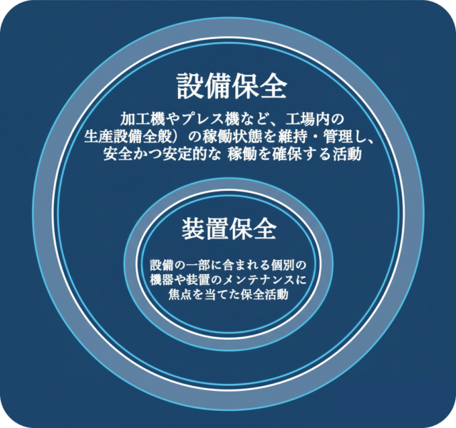 また、装置保全とよく似た言葉に設備保全があります。この2つは基本的には同じ意味で使われることが多いのですが、装置保全と比較して、設備保全はより広範な概念であり、両者の関係は下図のように表すことができます。