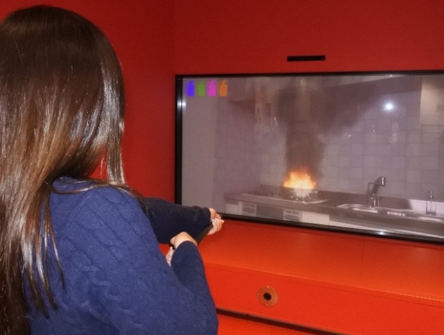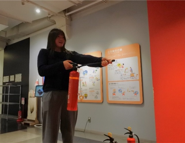 消火器の使い方を学ぶため、映像を使った消火体験ができます。