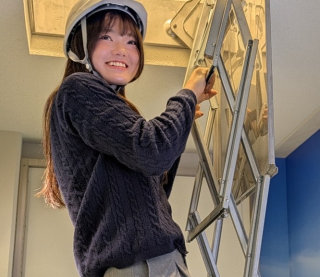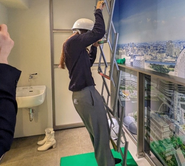 マンションやビルで災害が起こった時に地上に避難するための避難用はしごです。実際に使用されているものと同じものを体験することができました。日常的に目にしていても、使うことは意識していなかったので、貴重な体験になりました!皆さんも、いざという時のために普段から設置場所を確認しておくことをおすすめします。